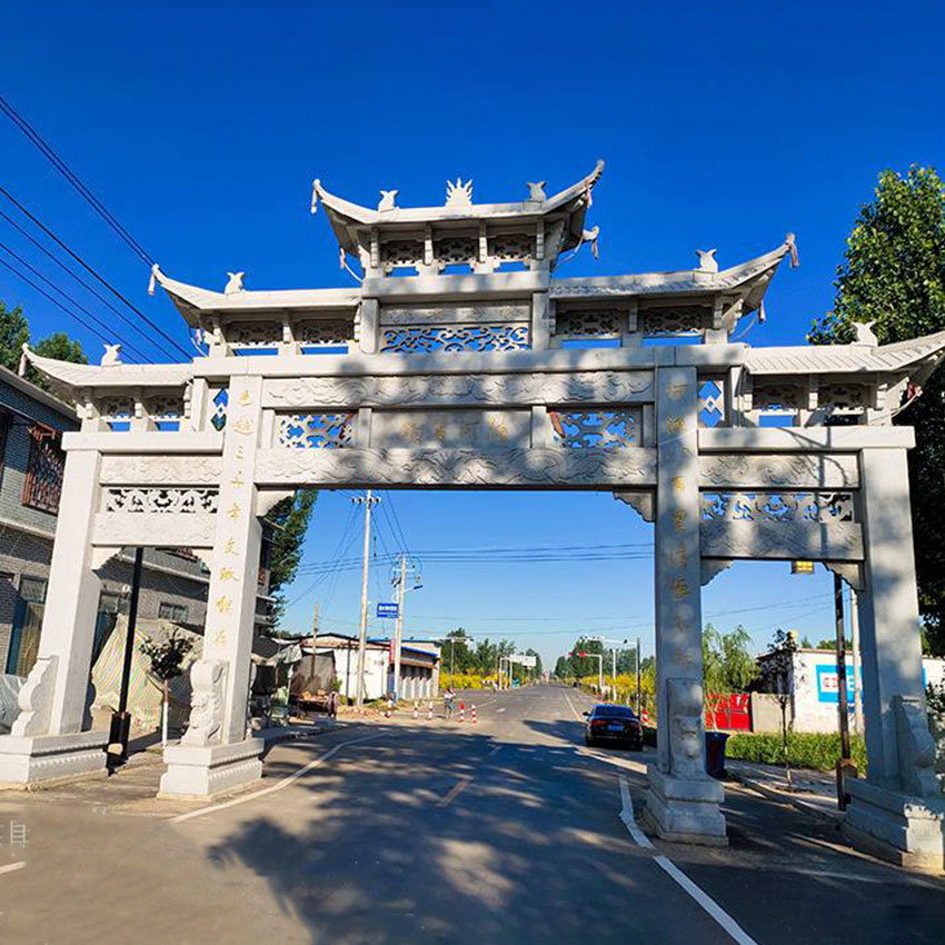 农村石牌坊*内特有的一种特色的标识性建筑,通常被解释为纪念性建筑物和功德性建筑物。农村石牌坊不仅传承了浓厚的历史文化内涵,而在现代石牌坊雕刻中又焕发了新的魅力。现在的乡村石牌坊风格分为一门三楼、三门三楼、三门五楼、三门七楼、五门七楼等,这几种石牌坊风格设计外型气派,雕刻精美,看起来更具宏伟和大方感,更能体现出村庄的美,彰显一方人文气质。