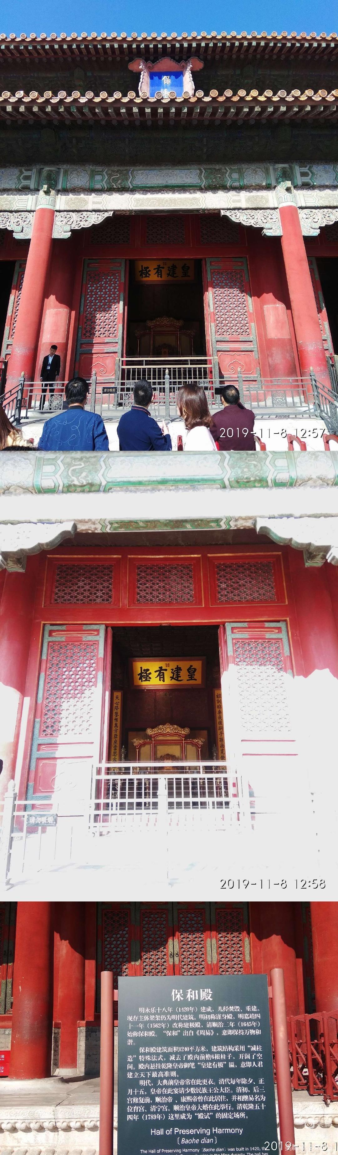 穿过太和殿来到三宫殿的第二殿中和殿,这是一个皇帝去太和殿路上累了休息的地方,也做一些丧葬典礼前宣读悼词什么的使用,但主要目的而是供皇上休息、思考。这里的牌匾上写着“允执厥中”(yǔnzhíjuézhōng)。意思是成为皇帝不论一言一行都要保证不偏不倚、公平公正,也是在休息思考的之后,不断告诫皇上的一句警言,时刻提醒自己唯有自己一心一意,精诚恳切的秉行中正之道,才能治理*家。